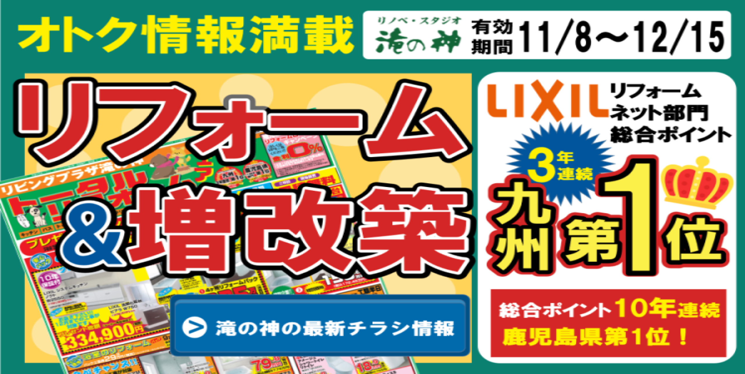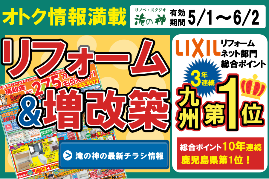 お得なチラシ【2025年12月25日まで】創業51周年祭特典!(令和7年12月10日まで)①お見積り特典:サイコロチャレンジでどん兵衛プレゼント(最低3個プレゼント)※1家族様1回限り、ご来場の上お見積ご依頼の方限定②ご成約特典:カタログギフト2万円分(150万円以上ご成約の方)、ブランド米5キロ(80万円以上ご成約の方)プレゼント※12月までに工事完了のお客様限定【鹿児島市・姶良市・伊集院地区のリフォーム・リノベーション・外壁塗装・屋根塗装・エクステリア・ガーデン】