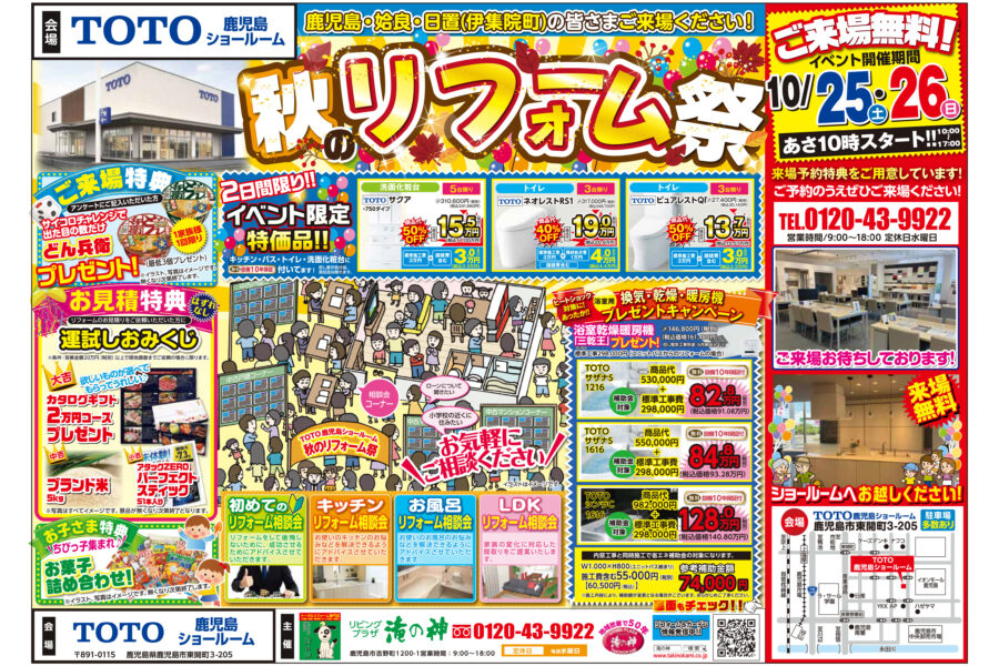 TOTOショールーム鹿児島】秋のTOTOリフォーム祭開催!ご来場特典盛りだくさん☆イベント限定特価品あります(2日間限り!)来場無料☆イベント開催期間:10/25(土)~10/26(日)あさ10時スタート(17時まで)【鹿児島市・姶良市・伊集院地区のリフォーム・リノベーション・塗装・外構・造園】