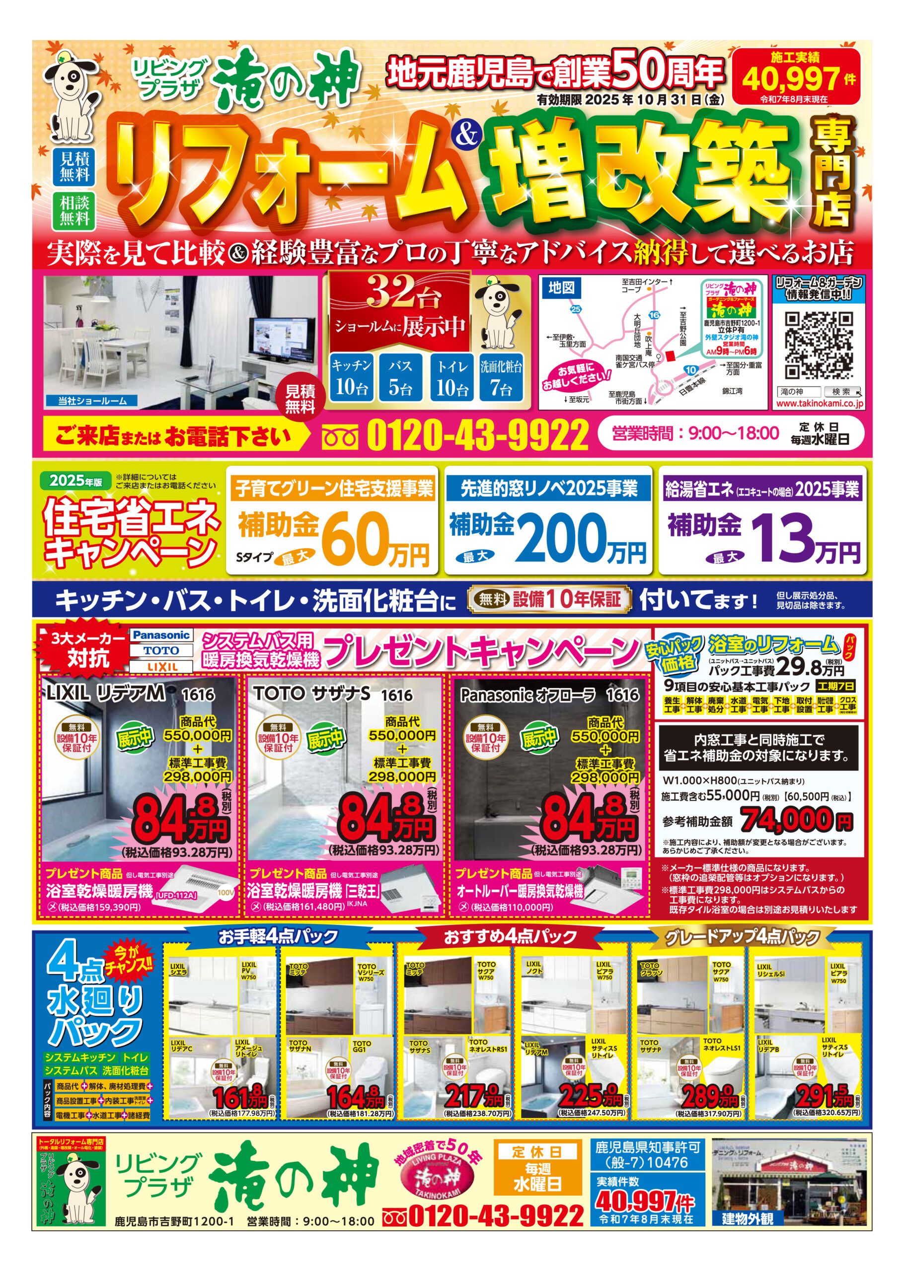 お得なチラシ【2025年10月31日まで】住宅省エネ補助金(2025年版)キャンペーン実施中!3大メーカー(Panasonic・TOTO・LIXIL)対抗★システムバス用暖房換気乾燥機プレゼントキャンペーン!お見積・ご相談無料で承ります【鹿児島市・姶良市・伊集院地区のリフォーム・リノベーション・外壁塗装・屋根塗装・エクステリア・ガーデン】 - 鹿児島市・姶良市・日置市のリノベーション&大規模リフォーム専門店リノベ・スタジオ滝の神